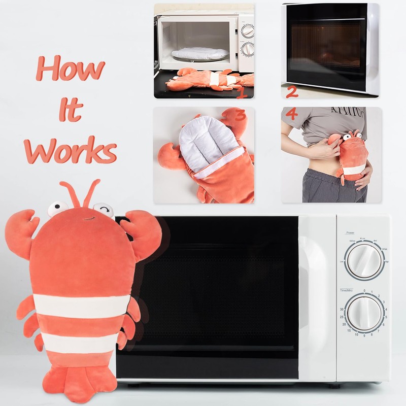 • Lobster Microwave Heating Pad Different from other heating pads, this lobster heating pad has no cords, saving you from getting tangled in wires when you want to rest. Simply remove the insert from the plush lobster and microwave for 90 seconds, to provide instant relief to your lower belly and back at that time of the month.