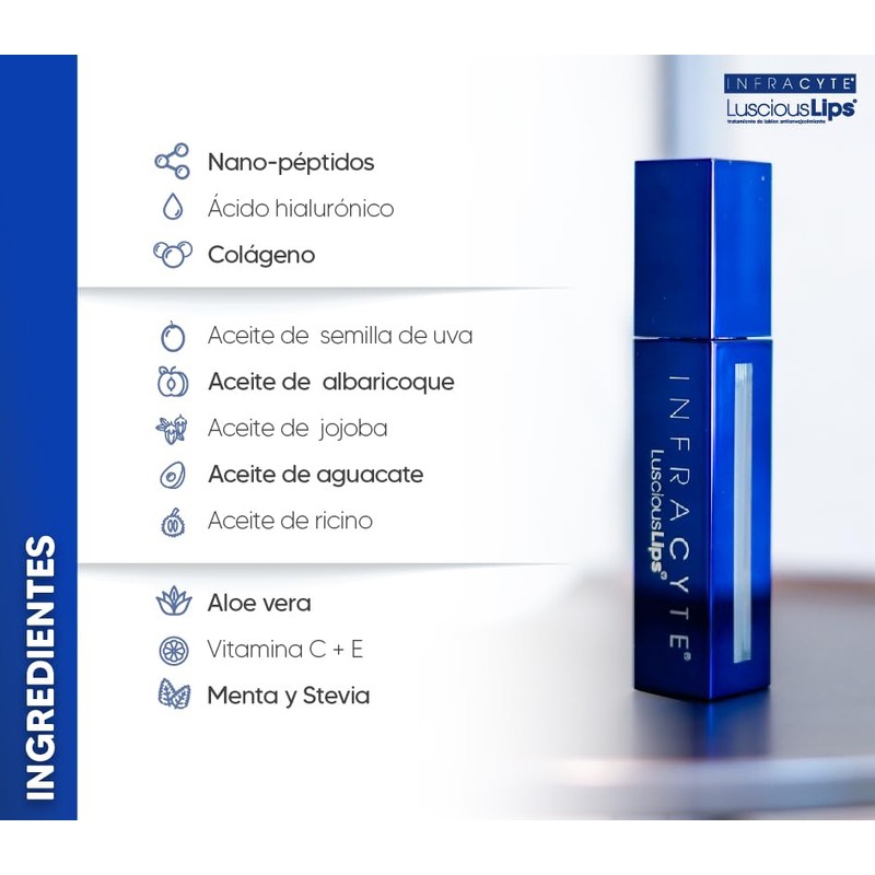 LuciousLips de INFRACYTE es un producto hecho en Estados Unidos con los más altos estandares de calidad. INFRACYTE es un laboratorio científico y no sólo cosmético por lo que encontrarás un producto de alta calidad en todos los aspectos. Este es un producto de grado médico, lo podrás encontrar en los mejores consultorios de Dermatologia, Medicina Estética y Cirugía Plástica. LusciousLips de INFRACYTE es el secreto para lucir unos labios irresistibles. Este increíble producto cosmético está diseñado para hidratar, suavizar y dar volumen a tus labios, dándoles un aspecto más atractivo. Con su fórmula única y enriquecida, LusciousLips proporciona una hidratación intensa y duradera, manteniendo tus labios suaves y sedosos durante todo el día. Pueden ayudar a combatir los signos del envejecimiento en los labios, como líneas finas y pérdida de firmeza. Prepárate para rejuvenecer tus labios y lucir una sonrisa más radiante. Potentes INGERDIENTES activos que le brindan labios más llenos, con más curvas y con un aspecto más juvenil: * Nano-péptidos * Ácido hialurónico * Colágeno * Aceite de semilla de uva * Aceite de albaricoque * Aceite de ricino * Aloe vera * Vitamina C + E * Menta y Stevia Nueva generación de terapias antiedad para el cuidado de los labios formuladas con funciones hidratantes, voluminizador, curación y mejora. Contiene potenciadores de colágeno, ayuda a reafirmar y tonificar los labios, protegen a los labios de daños de radicales libres. Probado por dermatólogos y formulado por científicos cosméticos.