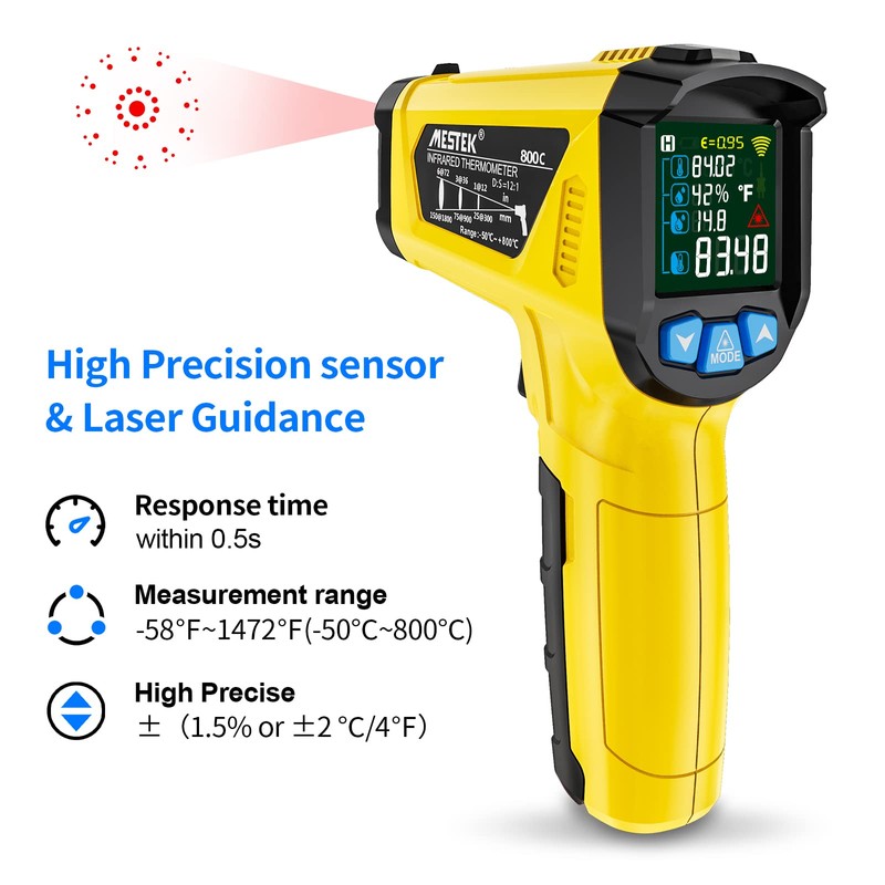 Infrared Thermometer MESTEK Temperature Meter Digital Laser IR Pyrometer K-Probe -50°C ~ 800°C Non-Contact with Colour LCD Alarm Function Adjustable Emissivity for Kitchen Grill Automotive