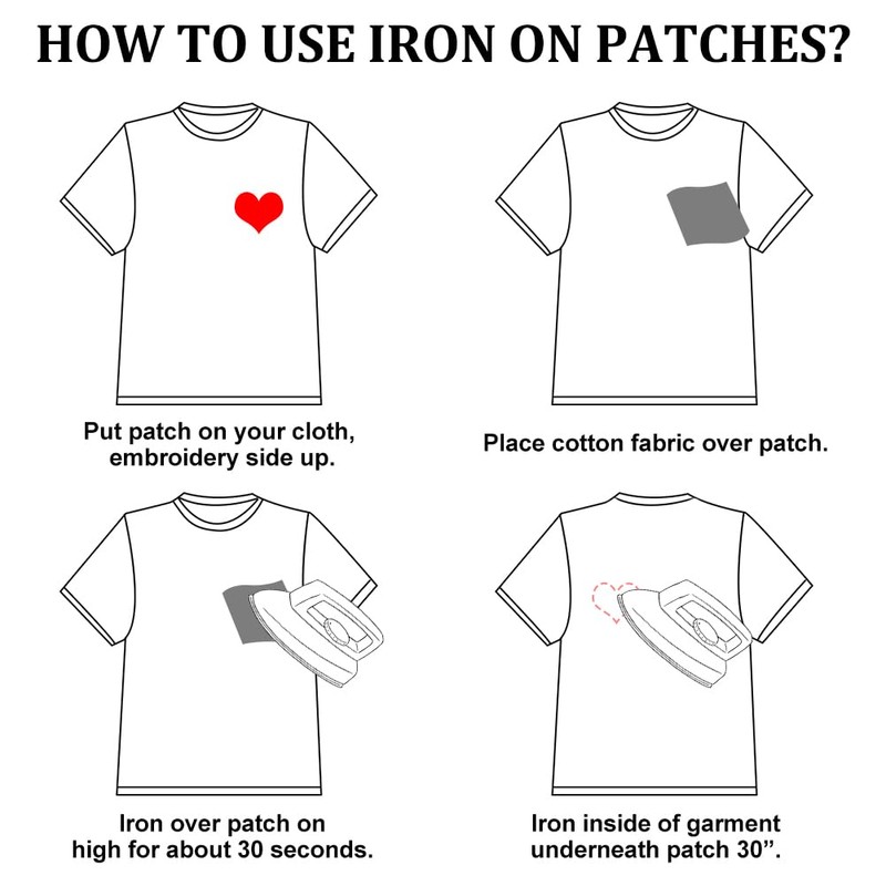 - EASY TO USE: Cover the patch with a thin cloth and iron it on your clothes for 15-30 seconds. Turn it inside out and iron the back for another 15-30 seconds. The hot melt adhesive will melt into the fabric. Depends on the size of the patch and the material of garment, it is recommended to sew along the edge of the patch with sewing machine or needle to further secure the patch.