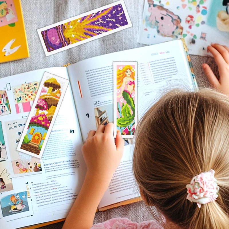 - Fairytale Cross Stitch Bookmark Sets: you will receive 6 pieces cross stitch aida fabric (2.44 x 7.9 inches) with pre-printed motifs of castles, elephants, mermaids, mushroom houses and other cartoon motifs, as well as enough multi-color cross stitch thread, 6 needles, 1 threader and 1 English instruction. The whole kit is enough to create 6 cross stitch bookmarks.