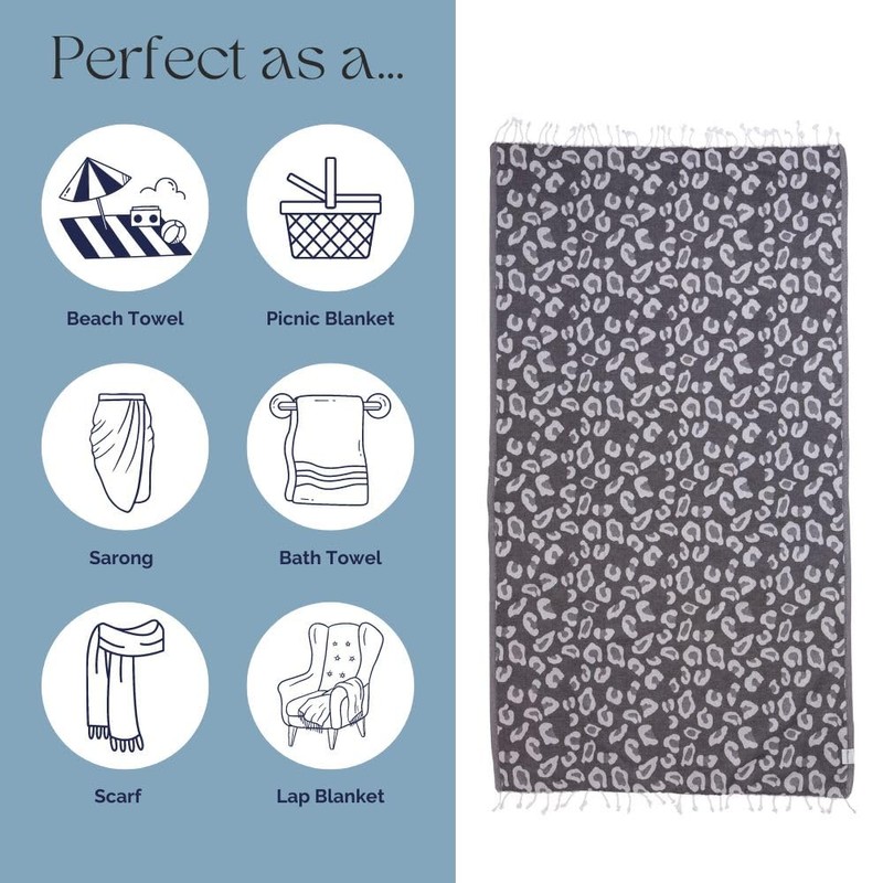 InfuseZen Turkish Bath & Beach Towel – Reversible Leopard Design - Turkish Cotton - Soft, Lightweight, Absorbent Peshtemal, Quick Dry, Sand Free – for Pool, Gym, Throw, Travel - Black