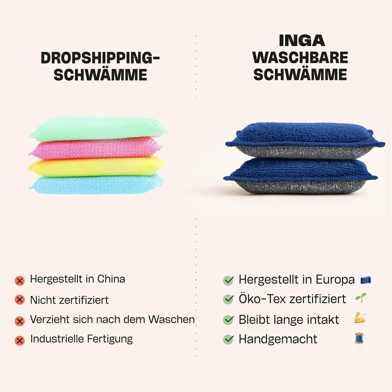 • 💰 UPGRADE TO SPONGE THAT LAST UP TO ONE YEAR AND SAVE MONEY: The life of 4 INGA sponges corresponds to the consumption of 200 disposable sponges, saves €130 and avoids 6 kg of waste per household. You will love switching from disposable to sustainable sponges with Inga.