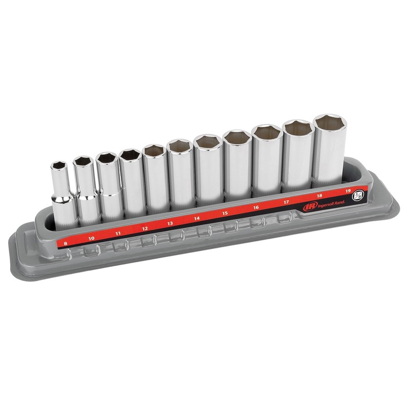 Ingersoll Rand 11-Piece 3/8 in. Drive Metric Deep Socket Set – 6-Point, Sizes 8mm to 19mm, Mirror-Polished Chrome Vanadium Steel with Vertical Knurling and Thermoform Tray – 752049X