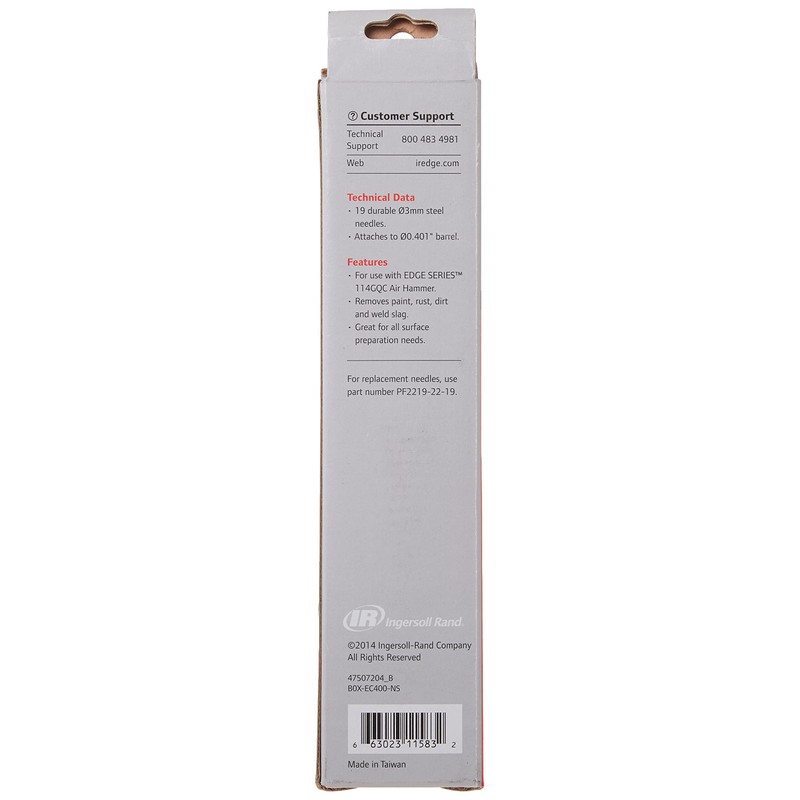 Change your air hammer into a needle scaler with just a twist of the arm! The IR EC400-NS Needle Scaler Attachment gives you the versatility you need to fly through real work. Designed for use with the Ingersoll Rand 114GQC Air Hammer (0.401 diameter barrel), and has a super easy screw on application. Effectively removes paint, rust, dirt and weld slag. Uses 19 3mm diameter steel needles with durable steel housing and has been rigorously tested to ensure its long-lasting performance. For more than 100 years, Ingersoll Rand’s advanced engineering, manufacturing, and service models have set a standard of excellence. Trust Ingersoll Rand to help you complete your work faster and easier than ever before.