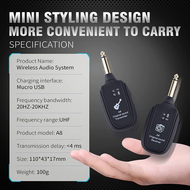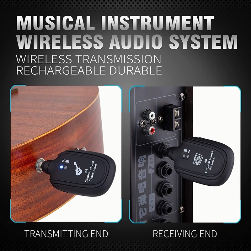 - 【Advanced Technology】: A8 Guitar Transmitter Receiver Adopts The Wireless 2.4GHz Frequency Transmission Technology, And A Frequency Range Spanning 20Hz To 20kHz,Supports Uncompressed Signal Transmitting And More Than 30m/100Feet Outdoor Transmission Range, Get Rid Of The Wire Tangled