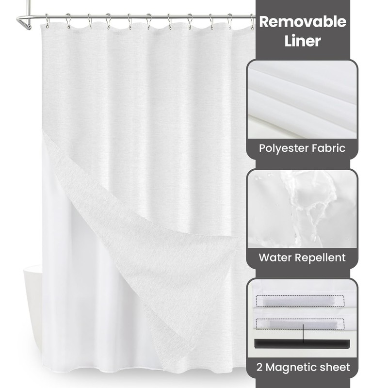 Inhousolu Boho Farmhouse Shower Curtain with Fabric Liner Set, Faux Linen Textured, 14 Metal Hooks Luxury Weighted Hem, Washable Wrinkle Free Bath Curtain for Hotel Bathroom 72" W x 72" L White