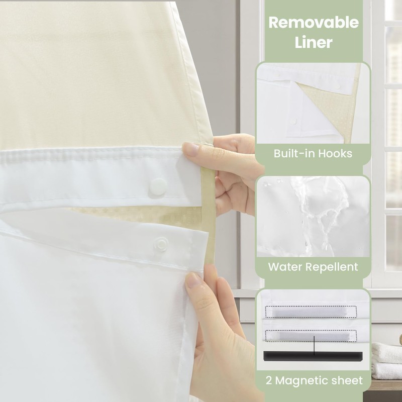 - NO HOOK SHOWER CURTAIN: This waffle weave shower curtain features 45°angled built-in split rings for fast 15 second setup—no need for hooks or taking down the rod. The no hook snap shower curtain fabric liner is easy to detach for cleaning