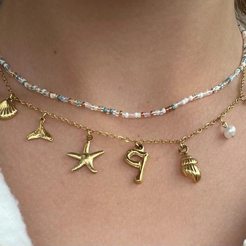 - DESIGN CONCEPT: The perfect summer necklace with a 7 charms that remind us the summer feeling. A unique letter pendant, A sun, a freshwater pearl, a conch, a mermaid fist tail, a starfish and a shell charm. This necklace isn't just an accessory; it's a journey, a keepsake of cherished memories and endless adventures. Wear this piece and feel an instant connection to the boundless energy of the sea, a surge of confidence and freedom.