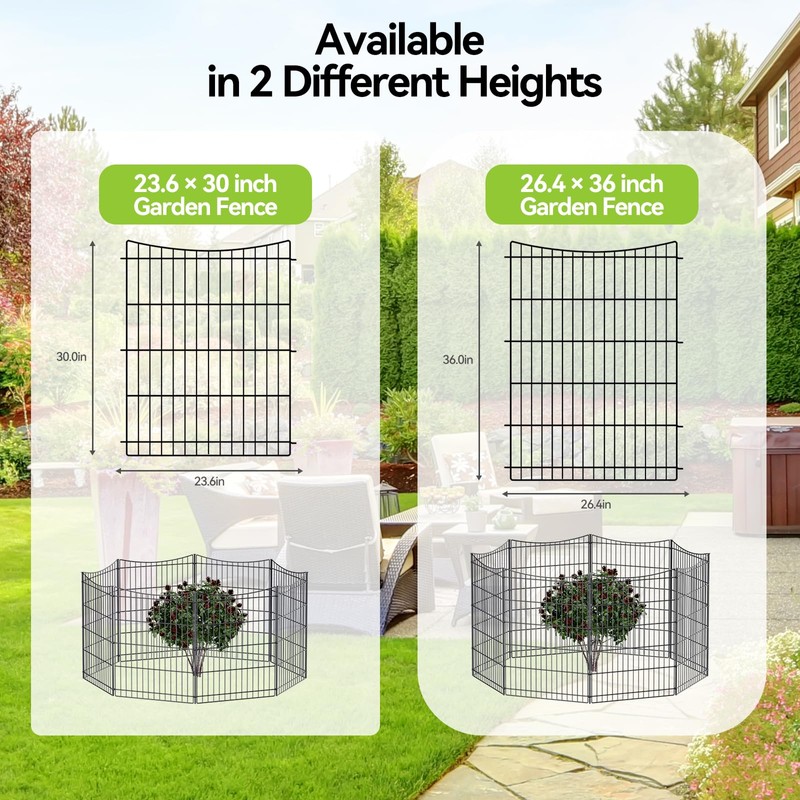 - Size:The classic curved design garden fence single piece measures 23.6" wide, 30" high, 1.45" gap, fence gate width 15.8". Comes with 7 metal stakes with a diameter of 0.39" and a height of 35.5", can be inserted into the ground up to 5.9 inches from the ground, which is strong enough. Connect 6 fence panels for a total garden fence length of approximately 11.8 ft. NOTE:This garden decorative fence has panels only, without a fence gate! You can use it as an extended fence