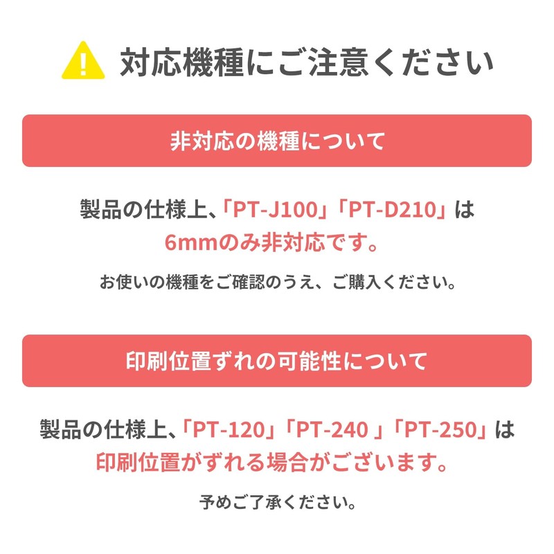 - [Compatible Models 2] PT-J100W / PT-J100P / PT-J100KW / PT-J100KTP / PT-J100SL / PT-J100SNL / PT-J100PHY / PT-J100MCR / PT-J100MB / PT-J100MR / PT-P300BT / PT-P700 PT-P710 BT / PT-P750W / PT-P900W / PT-P910BT / PT-P950NW *Due to the specifications of the product, the positioning of the print may be shifted. Please acknowledge