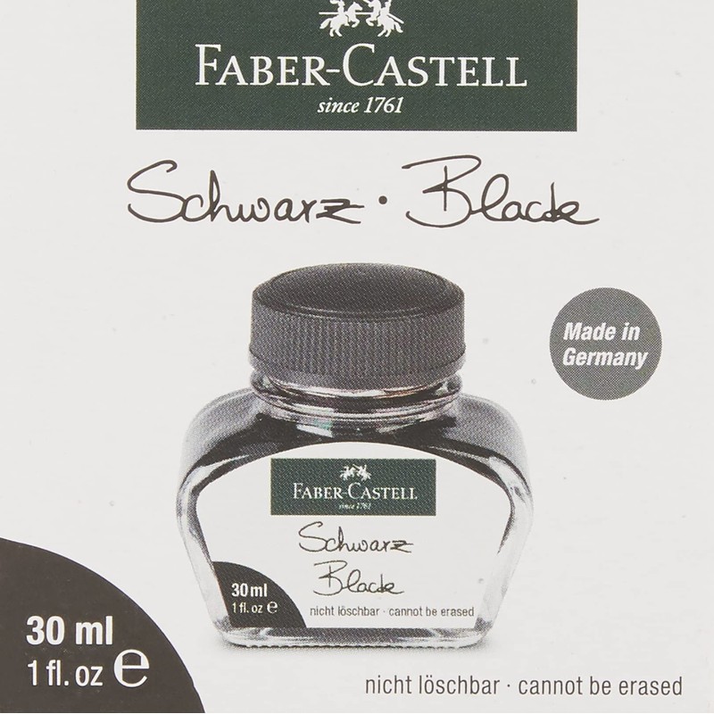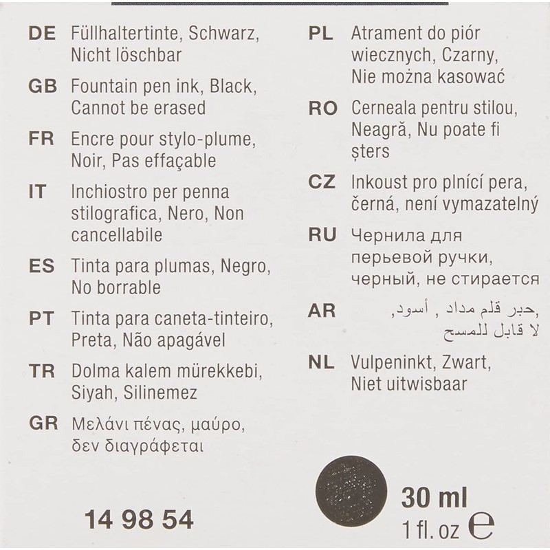 Black ink for fountain pen. Erasable. Washable For writing instruments with converter. Container type / content: glass with 30 ml. Color: Black Contents and packaging: in folding box.