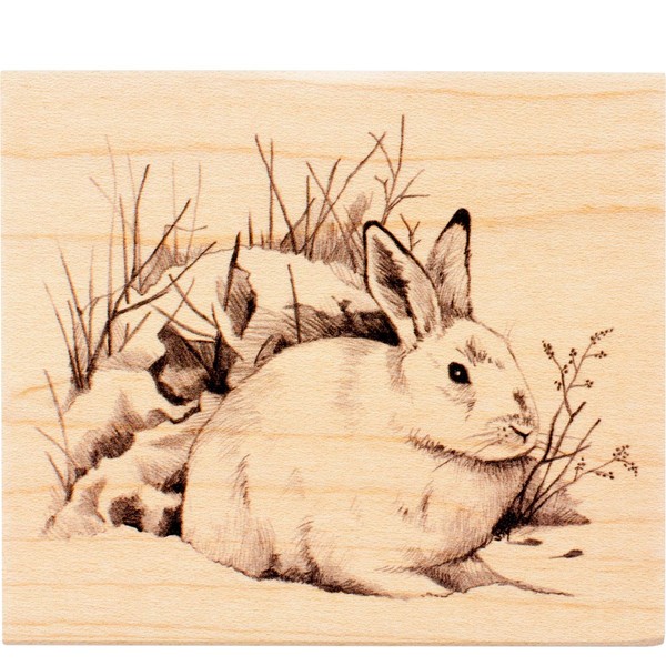 - This ink stamp features a beautifully detailed image of a hare resting beside a mound covered in freshly fallen snow.