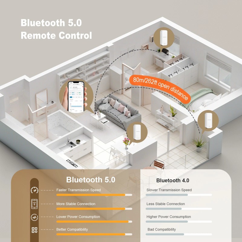 Data Storage with Export: High temperature and humidity resistance, compact and portable design makes it suitable for a variety of complex environments, such as low-temperature refrigeration, closed space, high humidity areas, etc.; according to different recording intervals, the device can save the most recent 30~300 days of data records, and in the cell phone APP can be viewed and exported nearly 2 years of historical data