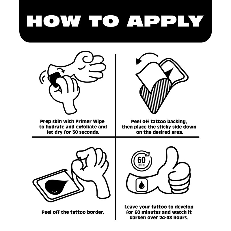 - Easy to apply: Easily apply your inkbox tattoo in 1-2 minutes and then chill for 1 hour. Take this time to read, sing, stream, meditate... you do you. Keep in mind, your tattoo will darken over the course of 24-48 hours.