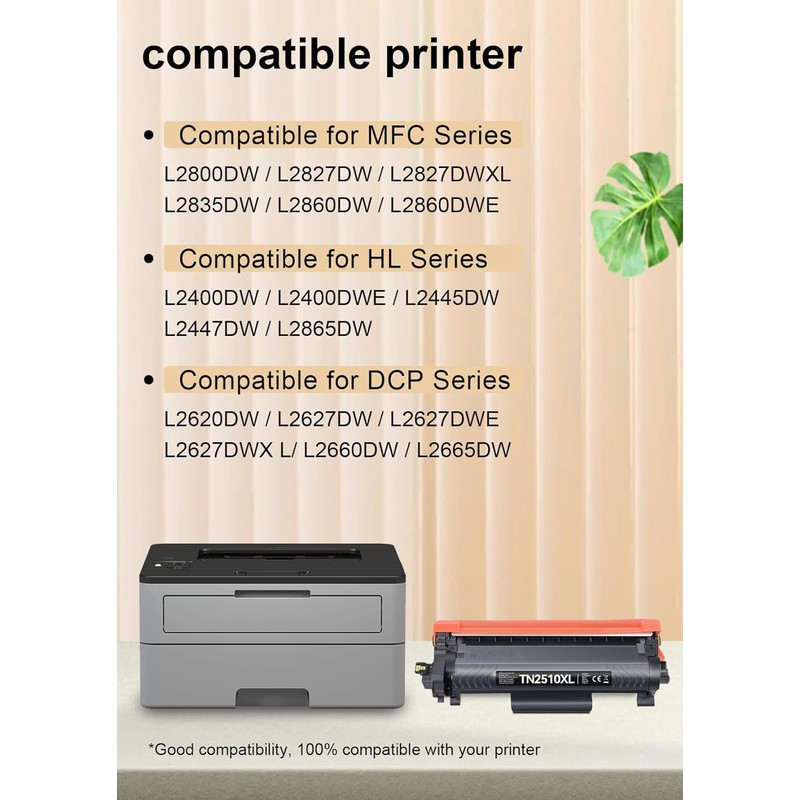 - TN2510XL Toner Compatible with: Brother HL-L2400DW / HL-L2400DWE / HL-L2445DW / HL-L2447DW / HL-L2865DW / DCP-L2620DW / DCP-L2627DW / DCP-L2627DWE / DCP-L2627DWXL / DCP-L2660DW / DCP-L2665 LDW / MFC-L2800DW / MFC-L2827DW / MFC-L2827DWXL / MFC-L2835DW / MFC-L2860DW / MFC-L2860DWE
