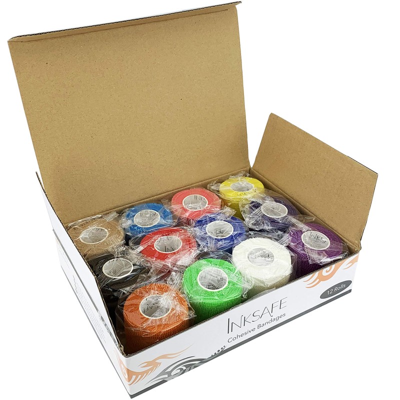 Inksafe Assorted Colours Self Adherent Cohesive Bandages 5cm x 4.5m Box of 12 - Uses Include Tattoo Grip Wrap, Vet Wrap, Tape for Wrist and Ankle Sprains