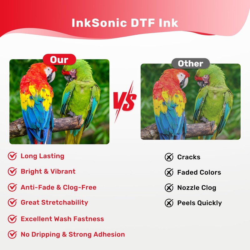 • ✅Work Smoothly: InkSonic DTF ink delivers consistent viscosity and excellent color retention, ensuring stable quality even during high-speed printing. 💡 Tip: Shake ink bottles thoroughly before use. White ink tends to settle faster—roll or shake daily to prevent clogs and separation.