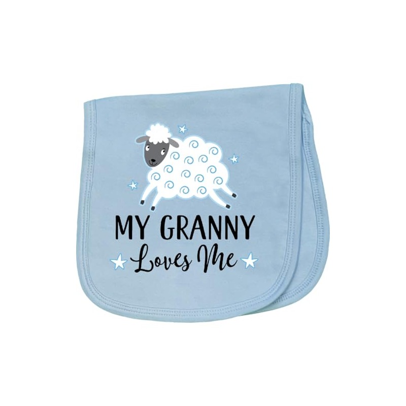 - My Granny Loves Me Baby Burp Cloth gift outfit for grandson from his grandmother featuring an adorable baby lamb
