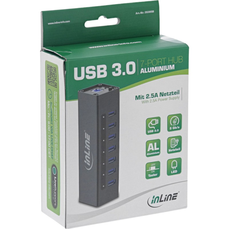 InLine 35395B USB 3.0 Hub, 7 Port, Aluminium Housing, Black, with 2.5A Power Supply