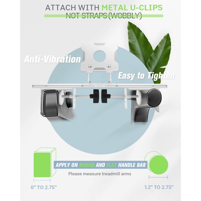 - An Unique Sturdiness Ensurance: Universal metal U-shape clips, apply on round (1.2"-2.75") and flat (0"-2.75") handlebar. An slim 2.36" cross bar maximizes the "useful area" between two treadmill arms. Just fold up the tray then ready for a no impedes running.