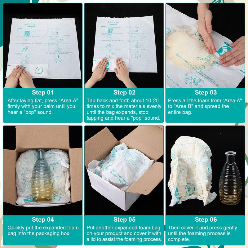 - Easy to Operation: only squeeze the liquid in the "A" and "B" areas to mix, then spread it as evenly as possible throughout the bag; Quickly place the expanded foam bag into the box and embed the product into the rising foam, and you will get a cushioning foam that fully matches your product