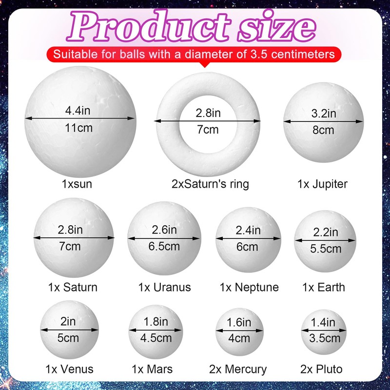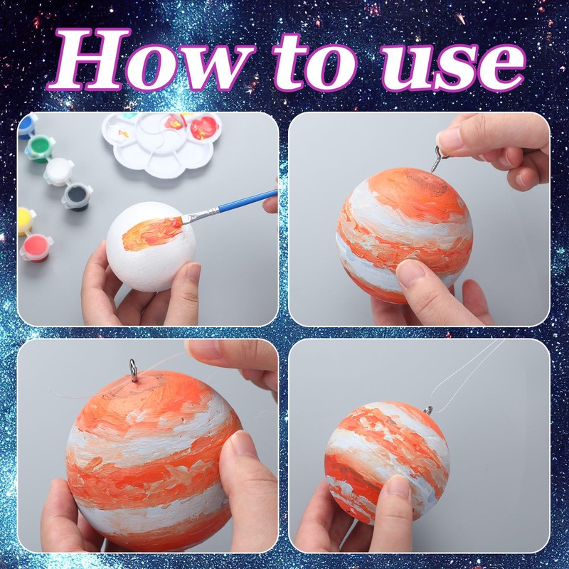 - Products Include: this inclusive solar system model kit will fuel your creativity and knowledge on a galactic scale! The package includes 14 foam balls, 12 colors of paint, 2 paintbrushes, a paint tray, and 3 rolls of fishing line; Additionally, it comes with a sun cardboard, a starry sky background, a colorful light string and 15 claw nails for hanging, providing everything you need to create a vibrant solar system creation