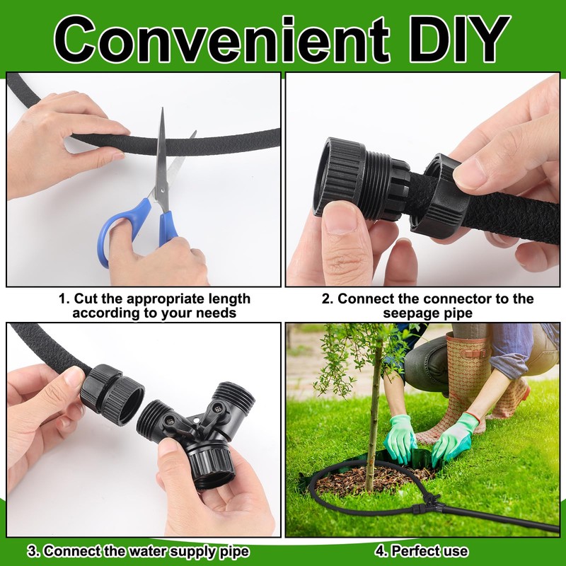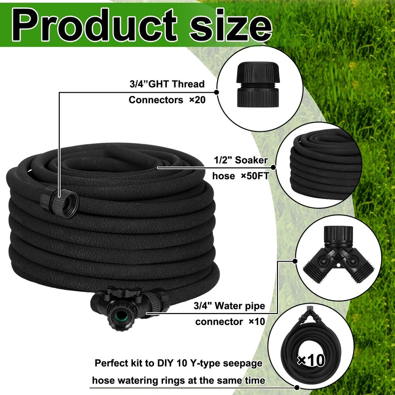 - Complete Kit: includes 50ft x 12 inch soaker hose, 10 y-splitters (3/4" thread), and 20 connectors, the tree soaker hose ring system is convenient to cut the appropriate size and install it according to your own trees and shrubs