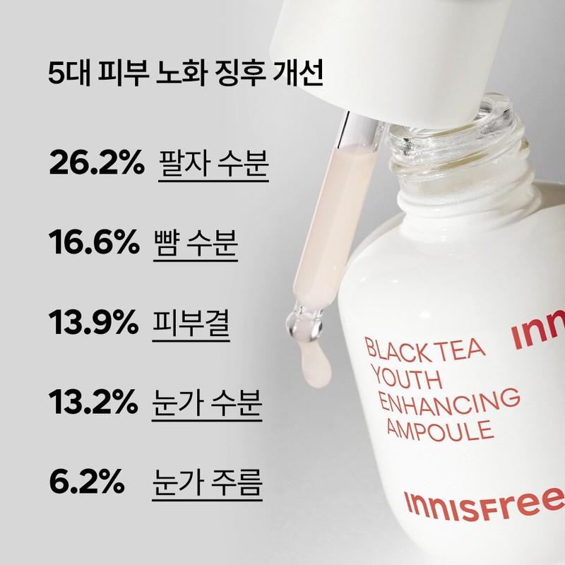 Black Tea Youth Enhancing Ampoule, INNISFREE's #1 anti-aging ampoule with the highest repurchase rate. For tired skin conditions caused by stress, parenting, and late nights, this product firms, moisturizes, brightens, and improves skin texture for a healthy dewy glow. It is a multi-anti-aging effect that simultaneously cares for the five most visible signs of skin aging, including skin texture, nasolabial folds, and eye area, and shows 26.2% reduction in nasolabial fold moisture, 16.6% in cheek moisture, 13.9% in skin texture, 13.2% in eye area moisture, and 6.2% in eye wrinkles. It is a three-dimensional care for skin that has lost its strength due to aging and external stimuli, showing 59.3% skin elasticity resilience, 15.42% skin density, 8.33% cheek elasticity, and 7.27% eye area elasticity. 96% say their skin feels nourished and 96% say their skin looks healthy. Dermatologically tested, non-irritant, and comfortable for sensitive skin. Recycled glass, recycled plastic cap. Made with soybean oil ink and FSC printing paper.