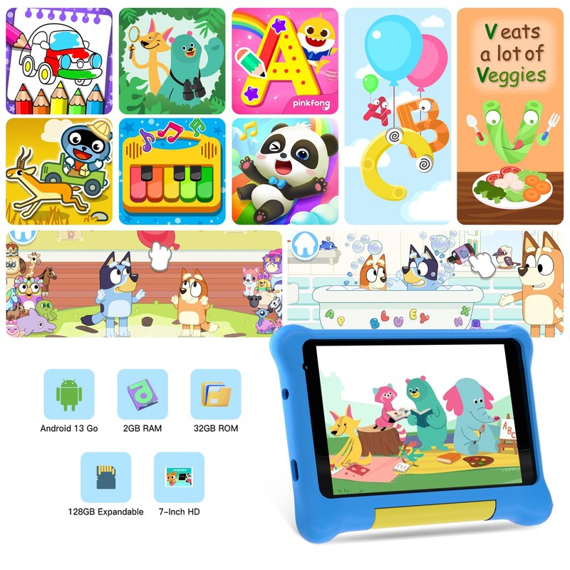 - ❥🎮【Full Featured 7 Inch Kids Tablet】This 7 inch tablet for kids features the latest Android 13 go system, 2GB RAM and 32GB ROM, providing a smoother running experience and user-friendly interface. Storage can be expanded to 128GB via micro-card slot, ensuring there's room for your child's favorite games, apps, and memories with expandable storage options. A ideal kids tablet companion for kids exploring.