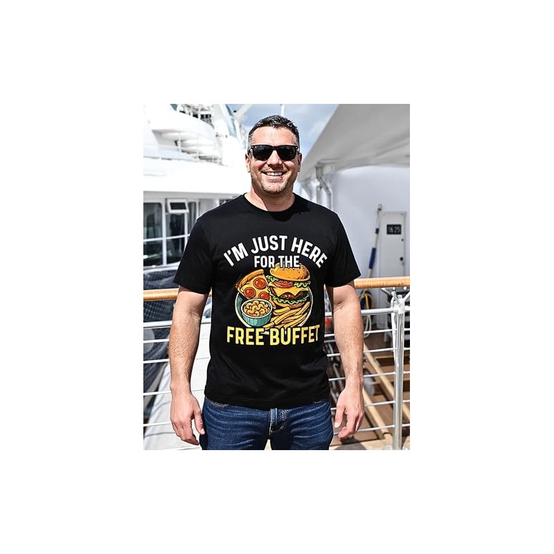 - [CRUISE-LIFE HUMOR] Featuring the bold phrase “I’m Just Here for the Free Buffet,” this shirt captures every cruiser’s real reason for boarding—unlimited pizza, burgers, fries, and mac & cheese. It’s a hilarious icebreaker and a relatable nod to every all-you-can-eat enthusiast
