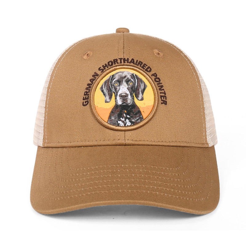 • 🐶 Iconic GSP Design: Features a bold embroidered patch of a German Shorthaired Pointer with soulful eyes and a sunset backdrop — a nod to the breed’s adventurous spirit.