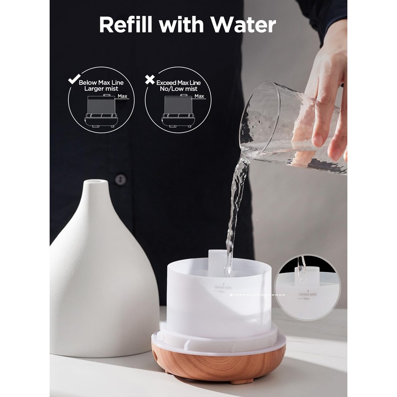 - Thoughtful Design: Featuring a safe auto-off function, this aromatherapy diffuser will automatically power off when water runs out. The chimney shape outlet ensures a high mist stream, leaving no vapor on your loved furniture. Built with a noise-reducing inner lid, it effectively reduces water dripping noise when running.