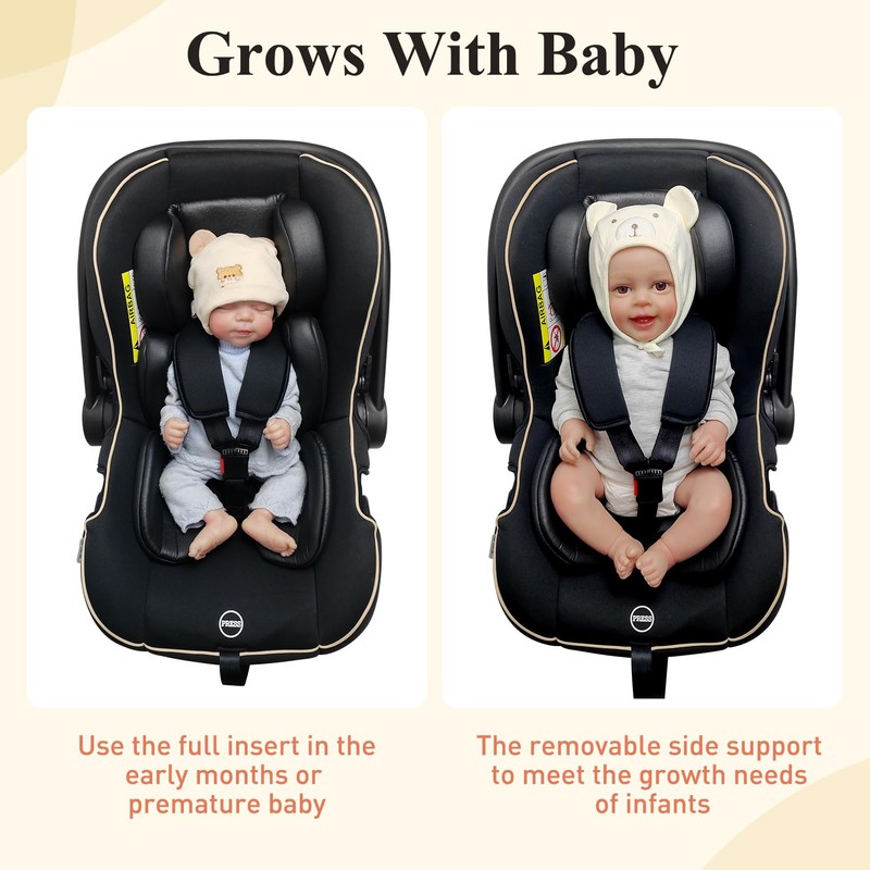 - Grows With Baby: Our baby car seat insert adapts as your baby grows! Use the full insert in the early months; then remove the head support as the baby gains better head and body control; The removable side support to meet the growth needs of infants, and is intended for use with newborns up to 22 pounds