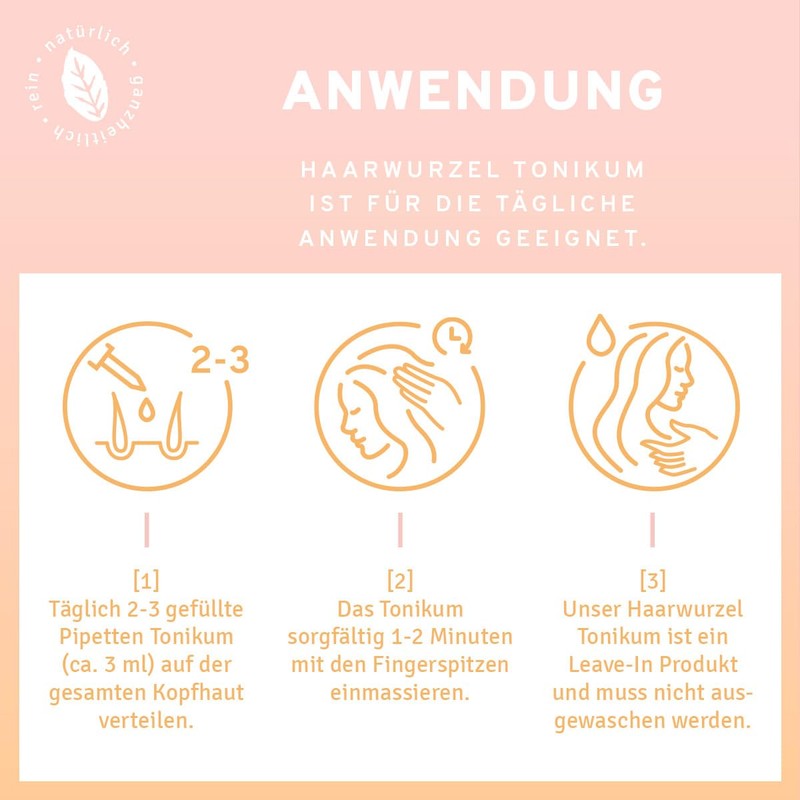 Wann verwende ich das Haarwurzel Tonikum? Gib am besten nach der Haarwäsche auf die feuchte oder trockene Kopfhaut ein paar Tropfen des Haarwurzel Tonikums. Scheitele dafür das Haar und trage das Tonikum mit Hilfe der Pipette gleichmäßig auf der Kopfhaut auf. Massiere das Tonikum sanft mit den Fingerspitzen ein. Unser Haarwurzel Tonikum muss nicht ausgespült werden. Warum sollte ich ein Haarwurzel Tonikum benutzen? Das Geheimnis kraftvollen Haars liegt in den Haarwurzeln. Unser Haarwurzel Tonikum kann sich positiv auf Dein Haarwachstum auswirken, weil es Dein Haar bereits in den Wurzeln pflegt und stärkt. Irritierte oder schuppige Kopfhaut wird beruhigt und dank der pflegenden Inhaltsstoffe wieder in ihr natürliches Gleichgewicht gebracht. Wie lange hält eine Flasche Haarwurzel Tonikum? Für eine Anwendung des Haartonikums reichen 2-3 Pipetten aus. Das sollte für ca. 40 Anwendungen reichen. Die Menge pro Anwendung kann jedoch individuell variieren, daher ist dies nur als Richtwert zu verstehen. Nach dem Öffnen ist unser Haarwurzel Tonikum ca. 6 Monate haltbar.