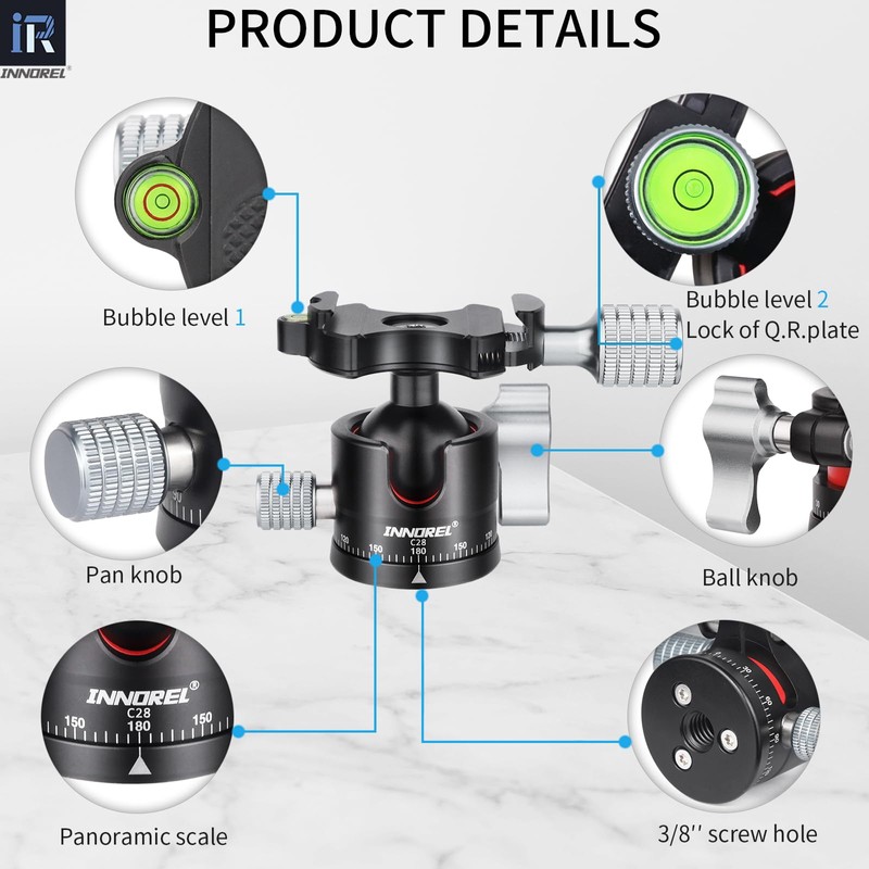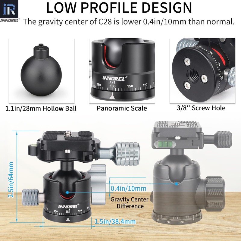 INNOREL C28 Compact Camera Head, 11.0 lbs (5 kg), Load Capacity, Aluminum Alloy, Arca-Swiss Compatible, Freedom Head 1/4" to 3/8" Mounting Size, Ball Head, Storage Bag Included
