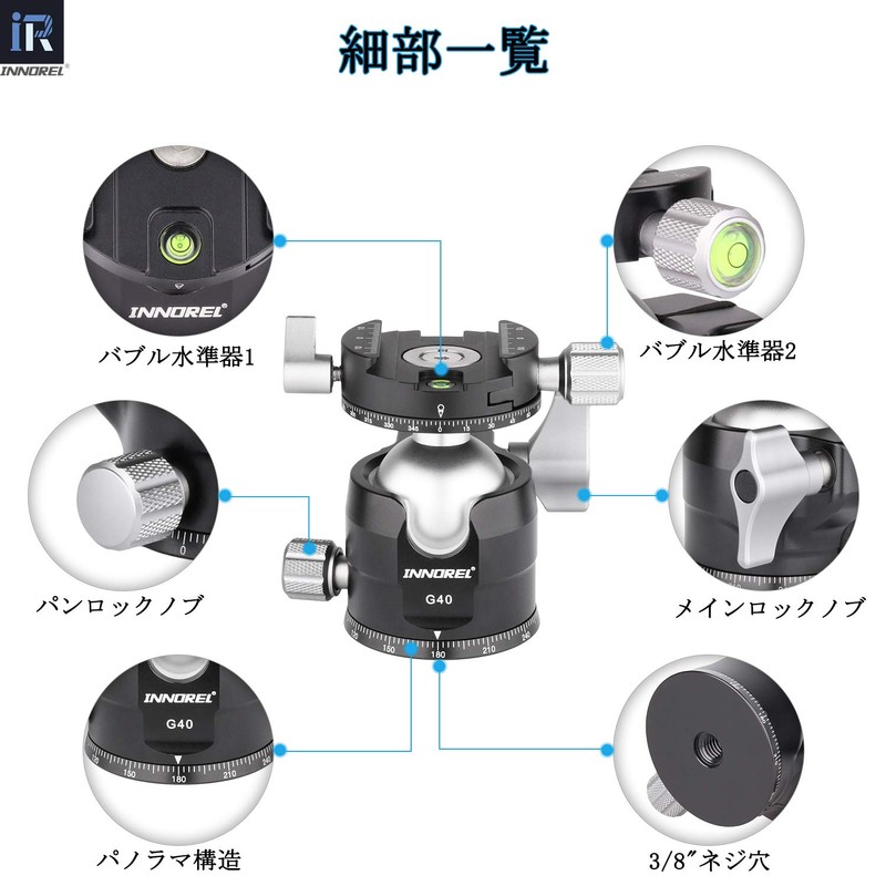 INNOREL Free Head Ball Head, Low Center of Gravity, Load Capacity up to 44.1 lbs (20 kg), Ball Head, Diameter 1.6 inches (40 mm), CNC Aluminum Alloy, Tripod, Monopod, SLR Photography, DSLR Camcorder,