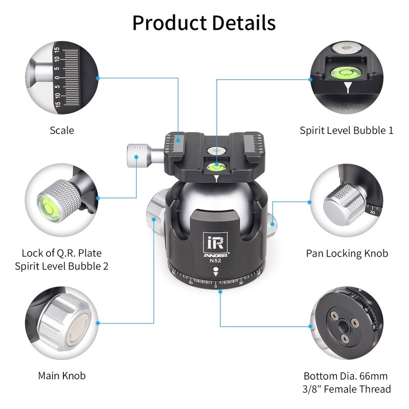 - Precise Adjustment There are 4 x 90 degrees, 5 degrees per scale and double spirit bubbles to meet the needs of accurate photography and panoramic photography.