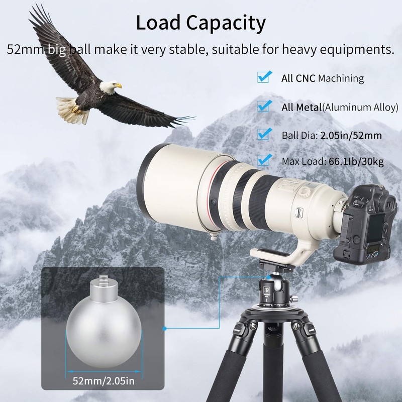 - STURDY LOW PROFILE The ball head is designed with low center of gravity, CNC machining and 52mm large ball diameter, making it extremely stable. Its security slot protects your camera at all times.