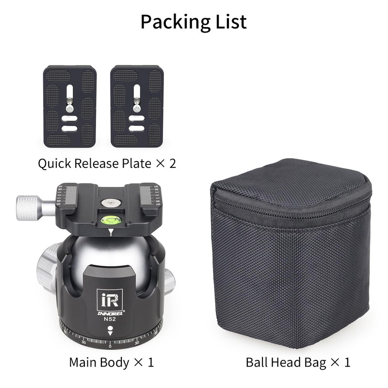 - Package includes a ball head, two quick release plates and one ball head bag.