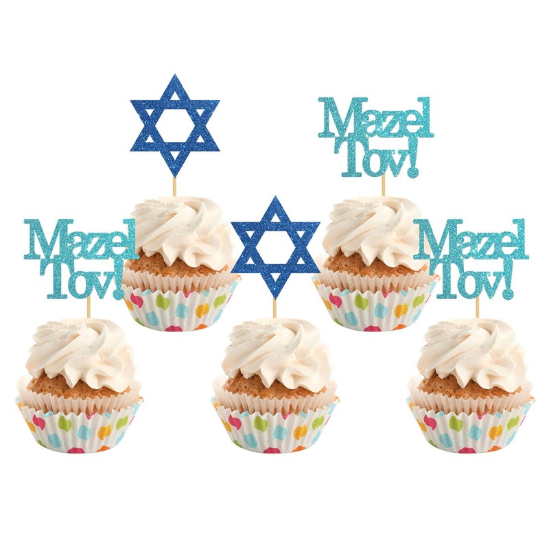 INNORU Mazel Tov Cupcake Toppers, Congratulations Party Decorations, Engagement, Baby Shower, Bar Mitzvah, Birthday, Wedding, Jewish Party Decorations Supplies, Pack of 24 Blue Glitter