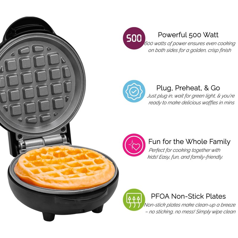 - Convenient Ready Indicator Light: Green light signals when the Mini Waffle Maker is preheated and ready.