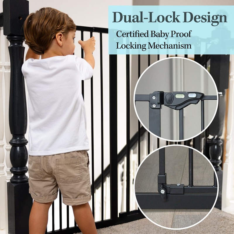 - Smart Dual Lock System – An Innovative Design That's Better For Kids And Parents Our Baby Gate For Stairs Features Two Locking Features Including A Pull And Lift System As Well As A Bottom Locking Design That Always Keeps It Locked Down Tight.