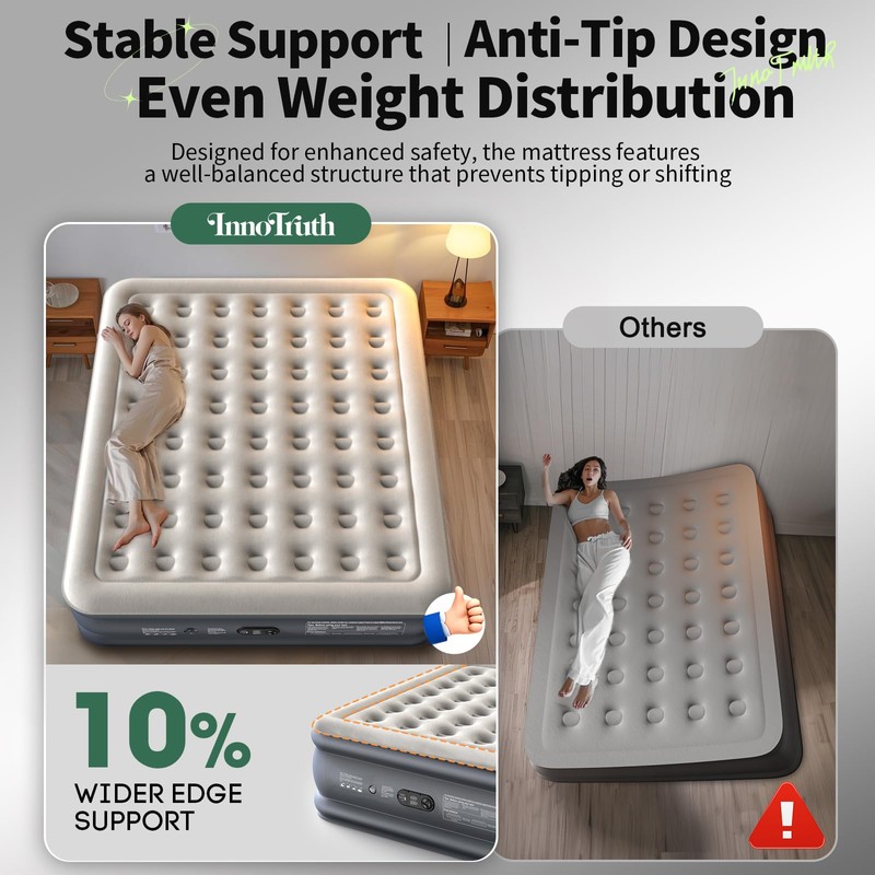 - ๐๐ซ๐๐ฆ๐ข๐ฎ๐ฆ-๐๐ซ๐๐๐ ๐๐๐ญ๐๐ซ๐ข๐๐ฅ๐ฌ: Made with 10% thicker, upgraded PVC, the InnoTruth airbed provides enhanced durability and reliable support. Its reinforced surface resists daily wear and tear, while the quiet, non-slip base keeps the mattress securely in place throughout the night