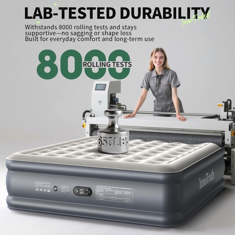 - ๐๐ง๐ซ๐ข๐ฏ๐๐ฅ๐๐ ๐๐จ๐ฆ๐๐จ๐ซ๐ญ: Enjoy quick, firm support with the InnoTruth air mattress, featuring a powerful 110V pump that inflates or deflates in just 3 minutes. The Smart Air Coil System conforms to your body's natural curves, evenly distrubuting weight to minimize sinking and relieve pressure on your back