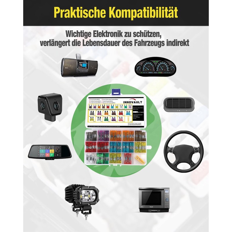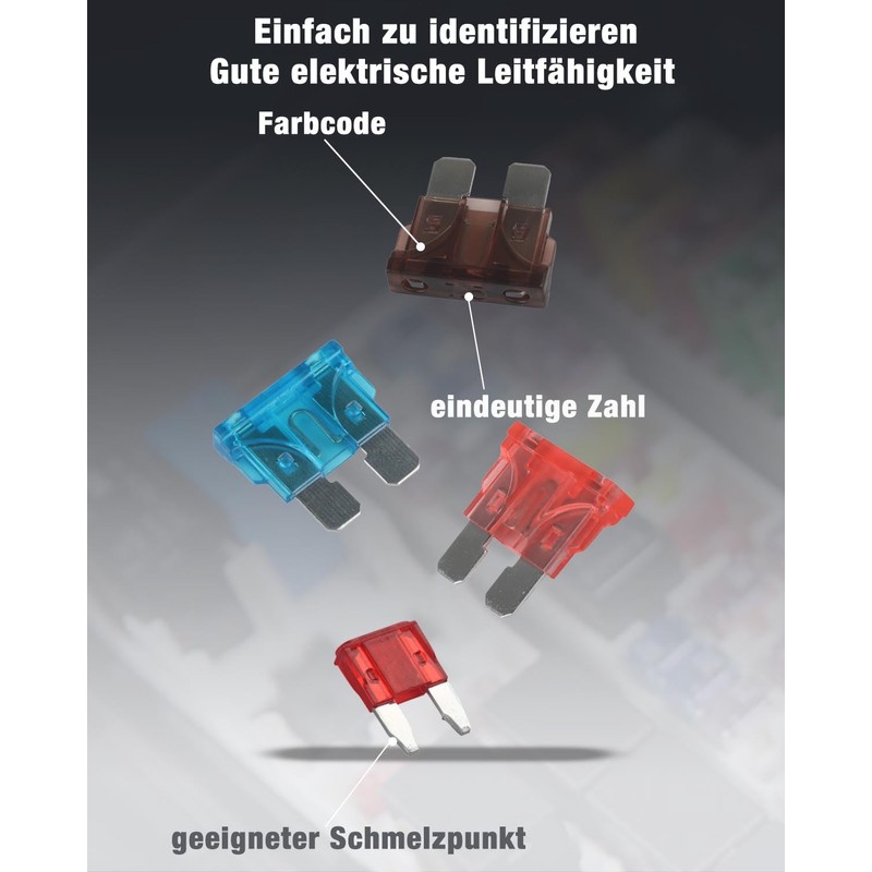 • Userfriendliness: the numbers on the product label in the car fuse set and on the bottom of the plug fuses indicate different currents. The old plug-in fuses can be replaced with the replacement fuses with the supplied fuse puller.