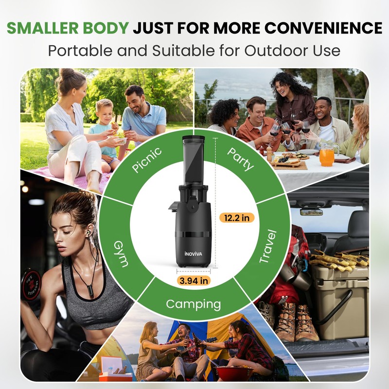 - COMPACT DESIGNThe cold pressed juicer adopts a compact and portable design, you don't need to spend more space to store the machine (Whole size: 12.24.723.94 inches). The delicate and compact body not only saves your kitchen space but also makes it easy for you to take it out with you at any time and enjoy fresh juice with your family and friends during picnics and camping
