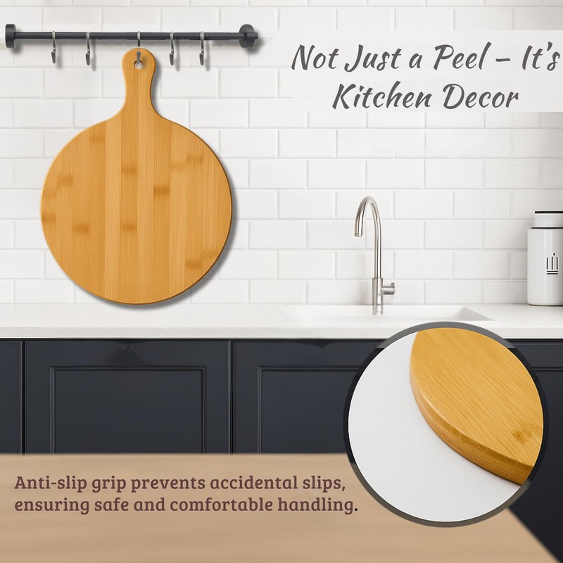 • Complete 12-Inch Pizza Peel Set: Includes a bamboo pizza peel, stainless steel pizza cutter wheel, and wooden cheese knife - everything needed to prep, slice, and serve pizzas at home.