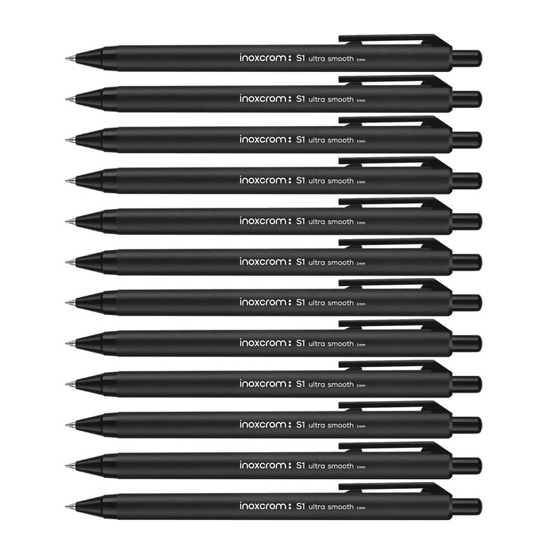 inoxcrom: S1 Retractable Ballpoint Pen Soft Writing Comfortable Grip Medium Tip (1mm) Box 12 Pens Black Ink