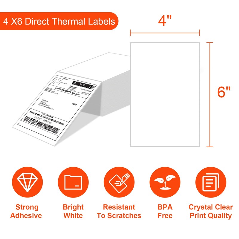 - [FADE RESISTANT AND RELIABLE]: Featured professional thermal paper, our 4x6 thermal labels perform well in all kinds of harsh environments, even in bad weather, the paper is still white and still can display the information completely and clearly. Not only waterproof, oil-proof, alcohol-proof, but also anti-plastic (chemical reaction), extremely durable.
